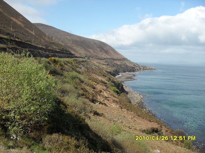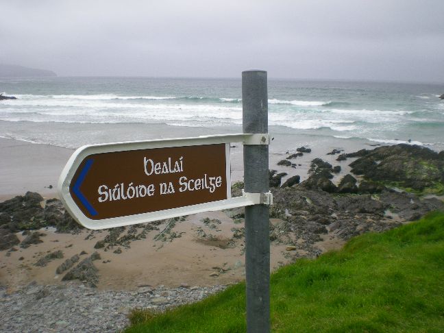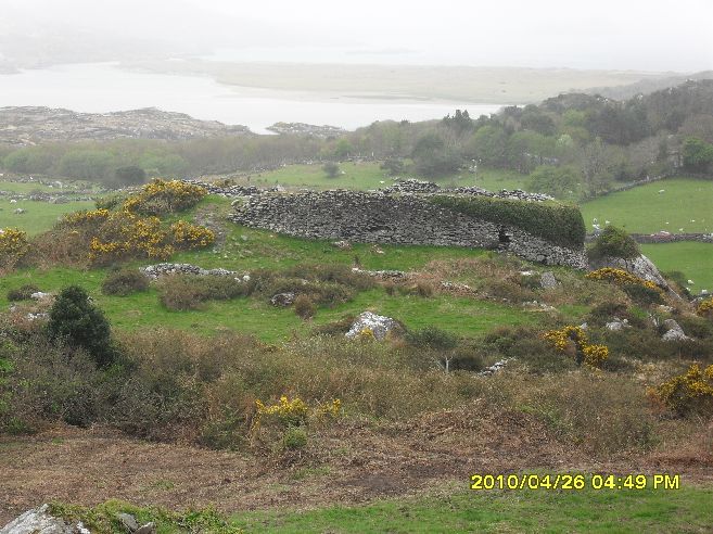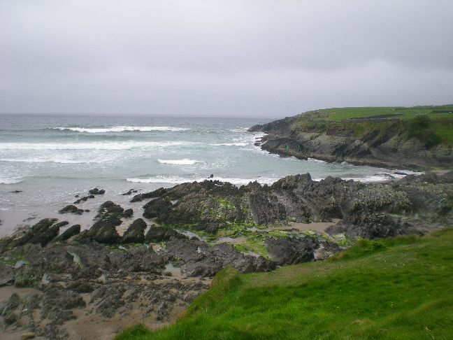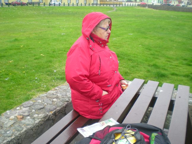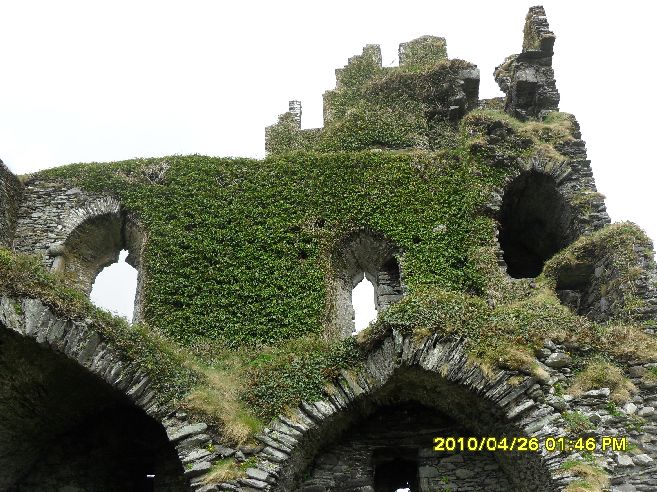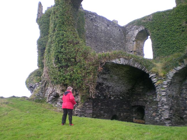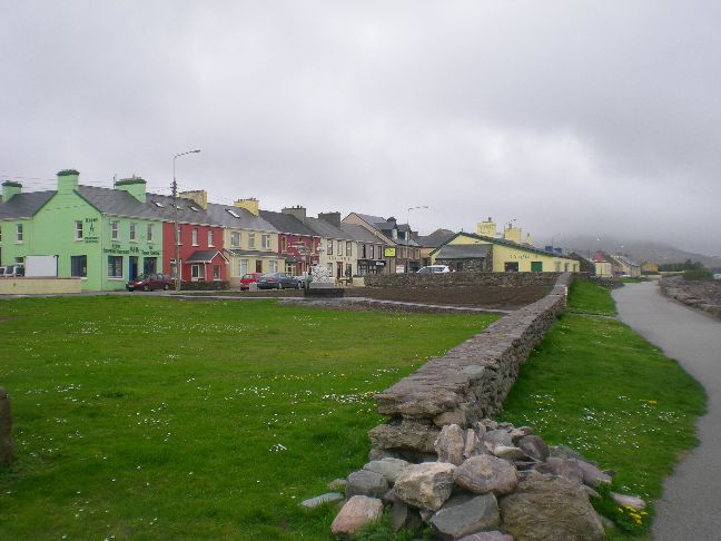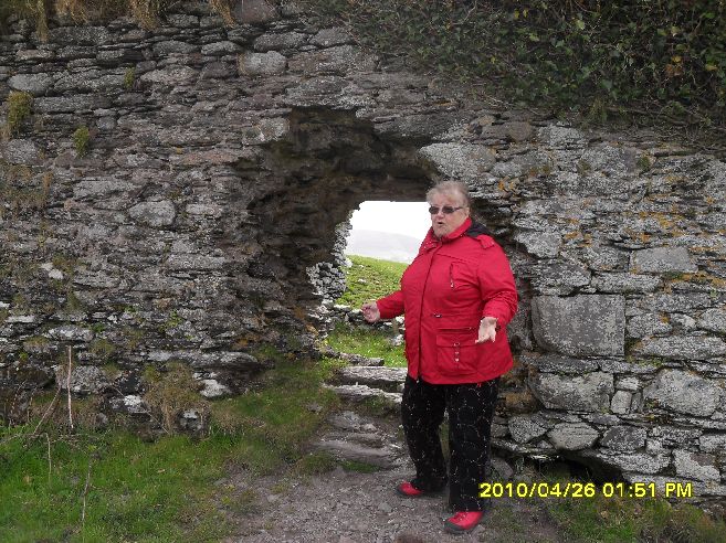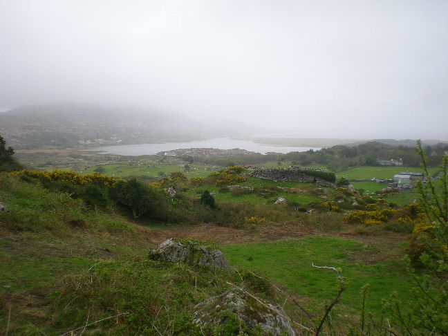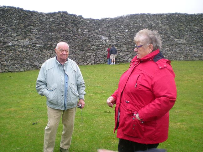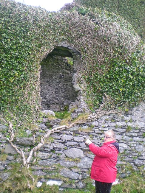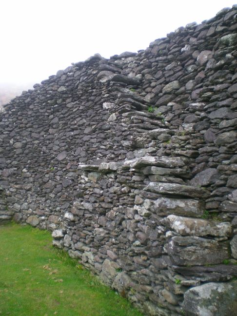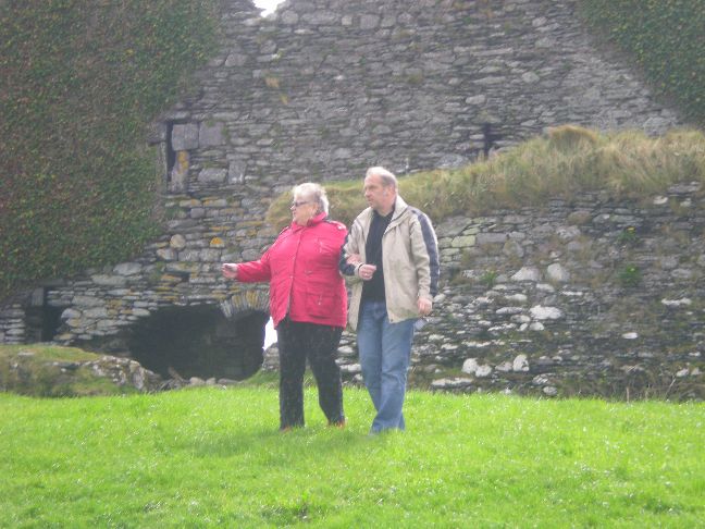 Der Tag 4 unserer "goldenen Tour" führte uns schließlich auf den "Ring of Kerry". Leider war auch dies wieder ein Tag, an dem sich die Sonne rar machte und so viele der wunderbaren Aussichten nicht ganz so eindrucksvoll waren, wie sie dies bei schönem Wetter sind. Über Killorglin folgten wir dem Rundweg zunächst bis zur Küste, von wo aus wir einen recht schönen Ausblick auf die Halbinsel Dingle genießen konnten. Das "Bellycarberry Castle" war schließlich ein weiterer Höhepunkt für meine Mutter (Baumarkt-Karte!!!). Allerdings mußte sie bald einsehen, dass die Burg zwar von der Nordseite noch ganz ordentlich aussah, auf der Südseite aber nahezu alle Mauern und Decken fehlten. Das ergab zwar einen schönen Einblick in das Gebäude, eine Renovierung erschien jedoch nicht besonders rentabel. Am "Skellig Ring", den man bei der Tour über den Ring of Kerry niemals auslassen sollte, fanden sich einige weitere Objekte, die manche gerne renovieren, andere der Einfachheit halber lieber sprengen würden. Als ein "Highlight" gedacht war der Ausblick auf die "Skellig Islands". Inzwischen hatte sich das Wetter aber so verschlechtert, dass tiefhängende Wolken die Inseln von uns versteckten. Nur ganz kurzzeitig konnte man manchmal erahnen, wo sich die Inseln befanden. Auch vom 395 m hohen "Knocknaskereighta", von wo aus man sonst einen eindrucksvollen 360° Rundblick über die Skelligs, die Iveragh Halbinsel und das Fischerdorf Portmagee hat, war uns jegliche Aussicht verwehrt. Sichtweite: 50 Meter. Deshalb begaben wir uns schnell wieder in tiefere Gefilde. Die Strandpromenade in Waterville lädt eingentlich zum Spazierengehen oder zum Verweilen an einer der zahlreichen Sitzgelegenheiten ein. Wir versuchten Wind und Wetter zu trotzen und machten hier unsere Vesperpause. Gemütlich war das allerdings nicht ... Das "Staigue Stonefort" bei Castlecove war unser letzter Sightseeing-Stop für diesen Tag. Millionen lose aufgetürmte Steine bildeten hier schon vor ca. 2500 Jahren einen Schutzwall für die Siedler. Das Ringfort hat einen Durchmesser von 27 Metern. Seine Wälle sind bis zu 5,5 Meter hoch und bis zu 4 Meter dick.